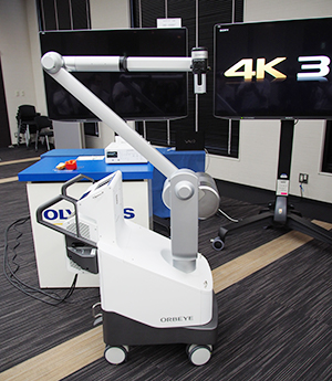 4K 3D手術用顕微鏡システムのORBEYE本体。デジタル化で接眼レンズなどがなくなり,アームの細径化なども合わせて重量も約50%軽量化された。