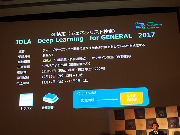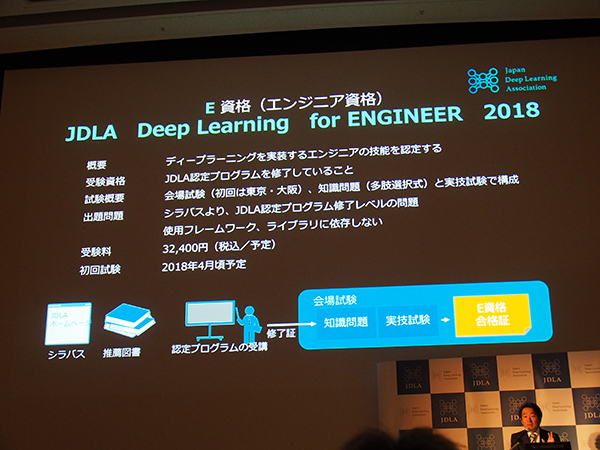 続いて運営事務局の岡田隆太朗氏が,JDLAの概要と人材育成・資格事業の内容について説明を行った。資格事業では,ディープラーニング活用に必要な人材育成のプログラムとして、ジェネラリストを育てるG検定、エンジニアを育成するE資格をスタートする。G検定は初回試験は12月16日(土)の予定で,オンラインでの試験を実施する。E資格は2018年春に初回試験の予定で,シラバスに基づいたJDLA認定プログラム修了した上で会場試験と実技試験を実施する。