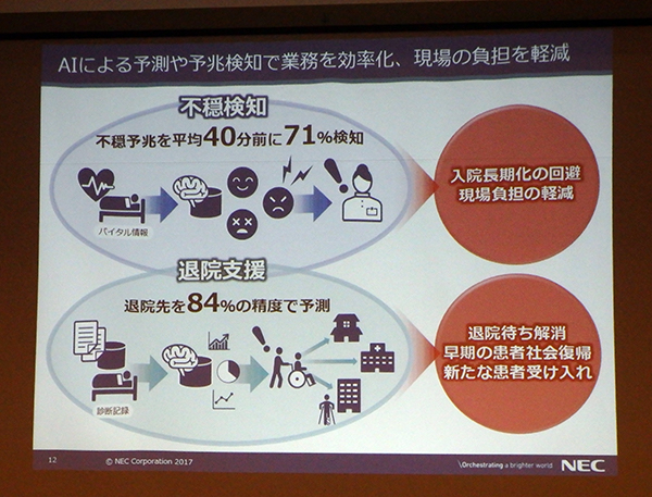 その一つが,医療従事者の負担軽減になると期待されるAIによる不穏検知である。これは,生体情報を解析して機械学習を用いることで,不穏の特徴パターンから徘徊や柵越えなど患者の不穏行動を事前に予測する。NECのAI技術群である“NEC the WISE”により,自律神経の乱れを示す特徴量を安定的に収集し,不穏パターンを高精度に識別することが可能である。実証実験では不穏行動の予兆のある患者を71%という高精度で,平均40分前に検知できたという。これにより,不穏行動に対応するスタッフの負担を軽減した。また,不穏行動する患者は,ほかの患者に比べ退院遅延の発生も多いが,その低減も図れたという。