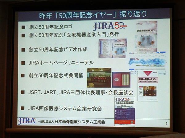 小松会長は,まず昨2017年に創立50周年を迎えたJIRAの歩みを振り返り,デジタル技術の進歩とともに,画像医療システム産業が発展してきたと述べた。その上で,創立50周年の活動内容を報告した。JIRAでは,2017年に,“50”の数字をあしらった記念ロゴの作成や,『医療機器産業入門』の発行,ホームページのリニューアルを行ったほか,各種の記念行事を展開した。6月には記念式典をKKRホテル東京(東京都千代田区)で開いたほか,8月には小松会長と日本放射線技術学会の小倉明夫代表理事,日本診療放射線技師会の中澤靖夫会長との座談会を実施。さらに,12月には恒例のJIRA画像医療システム産業研究会を記念行事の一環として,参加費を無料にして開催した。