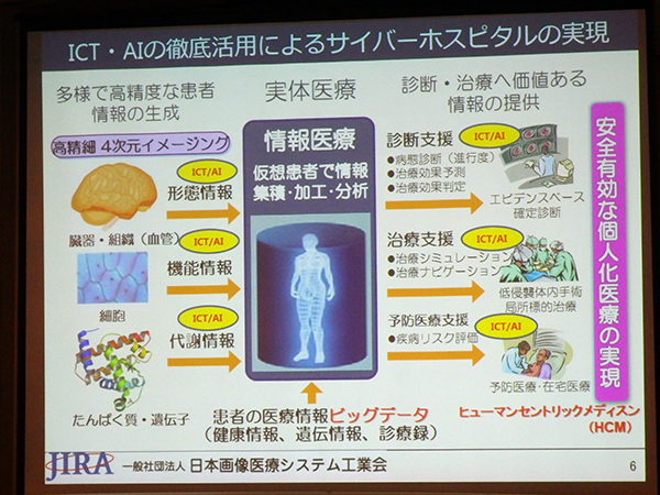小松会長は,これらの行事を紹介した上で,51年目がスタートしたJIRAの活動などを説明した。JIRAの活動に大きく影響するのが人工知能(AI)技術と言える。小松会長は,画像診断におけるCADの研究と,その中で生まれたニューラルネットワークが,ディープラーニングなどの機械学習の進歩につながっているとし,今後もハードウエアの進化によりAI技術は今後さらに発展すると述べた。一方で,AIが示した内容の根拠を説明できないといった課題も指摘した。さらに,小松会長は,AI技術を取り入れ,サイバー空間での医療と実際の医療を融合させたサイバーホスピタル構想の実現にも言及した。