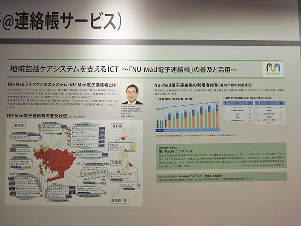 介護向けシステム大手の(株)ワイズマンは,医療施設と介護施設間で情報共有を行えるサービス「MeLL+(メルタス)」をPRした。医療施設が持つ患者基本情報,紹介状情報,カルテ所見など,介護施設の利用者基本情報,ケア記録,ケアプラン,サマリなどのデータをやりとりできる。コメントやメッセージ機能によってユーザー間で情報を共有することができ,地域包括ケアシステムにおける多職種連携を支援する。さらに,家族が参加できる「MeLL+family(メルタスファミリー)」の提供を2017年10月から開始した。また,インターネットプロバイダーの(株)インターネットイニシアティブ(IIJ)は,名古屋大学医学部附属病院先端医療・臨床支援研究センターが開発した「電子@連絡帳」をクラウドサービスとして提供する「IIJ電子@連絡帳」を紹介していた。愛知県内45自治体で導入が進んでいる。病院や在宅医療を提供する診療所,訪問看護ステーション,薬局,介護施設などの間で患者情報を共有することが可能である。