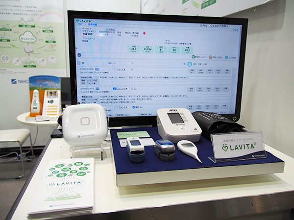 「LAVITA」のサイト画面と,連携するバイタル計測機器を展示