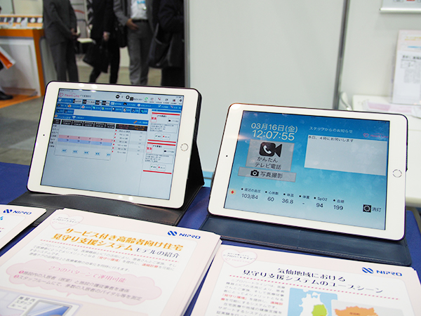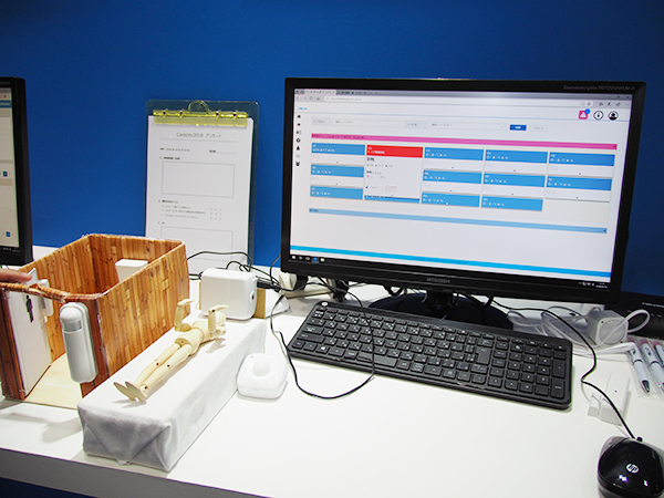 ICTにより介護施設の生産性・安全性の向上,業務負荷の軽減をめざすインフォコム(株)は,各種見守りセンサーやドアセンサーからデータを取得して1つのモニタに統合表示し,利用者の動きや身体状況を把握するシステム「ミマモア」を紹介した。個々に動作しているセンサーからデータを集めて分析することで,付加価値を提供する。初期費用を抑えた月額利用サービスで提供する。会場では,ドア開閉時にアラートを通知する機能をデモ展示した。