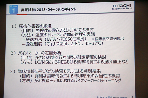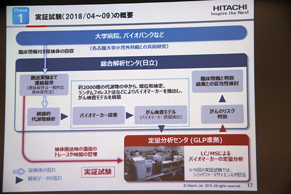 (株)日立製作所は2018年4月16日(月)に尿検体を用いたがん検査に関する実証試験を開始することを発表し,同日,本社(東京都千代田区)にて報道機関向け説明会を行った。説明会には,研究開発グループ基礎研究センタ長の山田真治氏と同チーフサイエンティストの坂入 実氏が出席した。