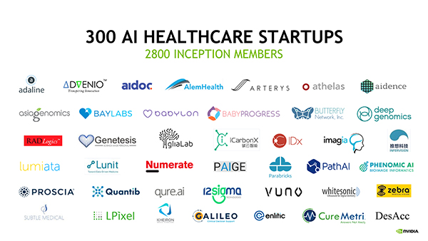 一方,スタートアップ企業支援としては,「NVIDIA Inception Program」を行っており,これに参加する約2800社のうち,約300社がヘルスケア分野のAI開発を行っているという。