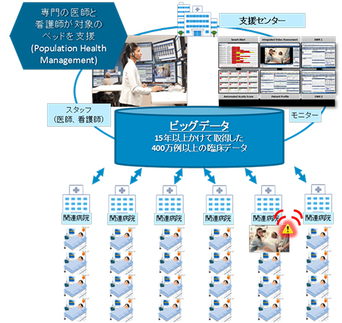 現在,日本では,ICUの専門医が約1400人,病床数が約7000床であるが,ICUでの治療が必要な患者数は増加傾向になる。また,ICUは医師や看護師のマンパワー,高度医療機器などが必要とされ,経営面からは効率性が求められている。さらに,マンパワーが都市部に集中しており,偏在化も問題となっている。こうした中,両者は2016年に,日本貿易振興機構(JETRO)や経済産業省の支援を得て,eICUの実用化に向けた実証研究をスタートさせた。このプロジェクトは,「重症患者の早期社会復帰を目指す」をビジョンに掲げ,(1)ICU滞在日数の適正化,(2)人工呼吸器装着日数の短縮,(3)ICU入室患者数の増加,(4)患者およびスタッフのさらなる安全・安心を目標にしている。
