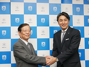 握手を交わす小口勝司昭和大学理事長(左)と