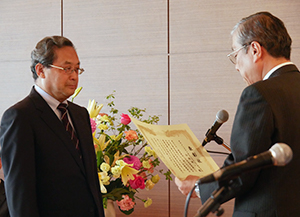 新延新会長から表彰状を送られる小松前会長