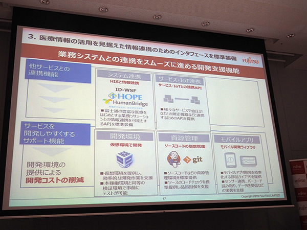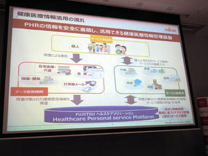 田中氏は,Healthcare Personal service Platformの活用事例としてサンスターとの共創で構築した“歯科医院向けクラウドサービス”や自治体向け健康医療情報管理サービスなどを紹介し,富士通がPHRの基盤事業に取り組むねらいについて,電子カルテシステムや地域医療ネットワークなど健康医療情報を扱ってきた豊富な実績と,ヘルスケアのみならず行政や流通などで業務システムを提供している同社のノウハウを生かした“クロスインダストリープラットフォーム”を提供できることを挙げた。田中氏は,PHR基盤の提供は,少子高齢社会の中で豊かで健康的な生活をサポートする取り組みであり,富士通として新しいサービスの提供をめざす企業や自治体とともに“共創”していきたいと述べた。