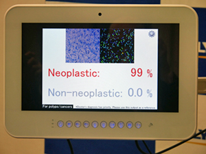 オリンパス(株)は,人工知能(AI)搭載の内視鏡画像診断支援ソフトウエア「EndoBRAIN」の国内販売を3月8日(金)から開始する。価格は450万円を予定しており,最大520倍の光学拡大機能を有する大腸用超拡大内視鏡「Endocyto」と内視鏡ビデオスコープシステム「EVIS LUSERA ELITE」と組み合わせて使用する。検査中,Endocytoが映し出す拡大内視鏡画像からリアルタイムに腫瘍性・非腫瘍性ポリープを自動的に判別し,腫瘍・非腫瘍の確率を数値で表示して医師の診断を支援する。また,NBI観察と染色観察の2種類の観察モードに対応している。