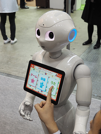 ソフトバンクは,東京ケアウィークの展示に合わせ,人型ロボット「Pepper」の介護施設向けの無料トライアルキャンペーンを行った(受付はすでに終了)。介護施設向けの「Pepper for Biz」には,(株)ロゴスが開発した“まいにちロボレク”,“まいにちロボリハ”,“顔レコ”の3つのアプリケーションが搭載されている。まいにちロボレクでは,ゲームや体操,歌など多くのコンテンツが搭載され,各コンテンツを組み合わせてプログラムを作成することで,Pepperがレクリエーションを実行し,スタッフの業務効率化につながる。また,顔認証(顔レコ)と組み合わせ,リハビリテーション(ロボリハ)や個人レクリエーションを行うと,利用者ごとの結果や利用回数のデータが蓄積され,専用の管理画面で確認できるメリットを来場者にPRした。