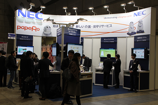 NECプラットフォームズは,コミュニケーションロボットのオープンプラットフォームである「PaPeRo i」を中心にパートナー企業と共同で出展し,介護向けのソリューションを紹介した。共同出展したのは,(株)ソルクシーズ,NECソリューションイノベータ北海道支社,コンロッド,システムアプローチ,ソフィアプランニング,藤カマンダーソフト。