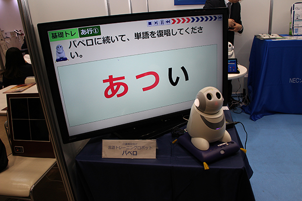 また,別ブースで出展したNECソリューションイノベータは,PaPeRo iを用いた言語トレーニング支援サービスを紹介した。高齢者や言語トレーニングが必要な利用者を対象に,言葉の発声・復唱トレーニングを支援する。PaPeRo iの発声に続いて復唱し,口やのどの筋肉を鍛え,口腔機能向上にも役立つ。あらかじめ言語聴覚士が個々の利用者に合わせて組んだプログラムでウォーミングアップを行い,スタッフはその間に別の利用者のトレーニングを行うといった使い方も可能。言語聴覚士や歯科衛生士などがいない施設でも,専門家の監修による早見表を基に,例えば食べこぼしが気になる利用者は「パ行」を繰り返しトレーニングするなど,目的に合ったトレーニングが設定できる。
