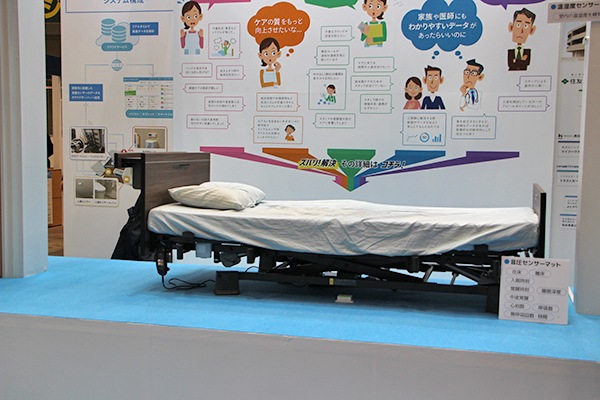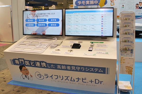 エコナビスタ(株)は,大阪市立大学医学部疲労医学講座と共同開発した健康見守り型クラウドサービス機器「ライフリズムナビ+Dr.」を紹介した。ベッドのマットレス下に敷くセンサーマット(体動センサー)と天井に取り付ける人感センサー,温湿度センサーからの情報やアラート履歴を,PCやタブレットでまとめて表示できる。異常時には,スマートフォンなどにリアルタイムでアラートが表示され,人手が少ない夜間の業務をサポートする。夜間スタッフを削減でき,「働き方改革」に直結することから,利用施設数は年々増加している。
