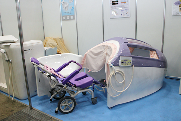 東京ケアウィークに初出展したエア・ウォーター(株)は,超微粒子シャワー入浴装置「美浴(びあみ)」シリーズのリクライニング式装置(NB2500)を紹介した。美浴シリーズは,超微粒子シャワーとサウナ効果で高い温熱効果が得られ,装置内でボディソープを使用して入浴と全身洗浄が同時に行える。また,入浴時間が通常の約1/3の10分程度に短縮できるうえ,介助者一人で操作でき,介助者の身体的負担を軽減する。掛け流しのため,常に新しいお湯で入浴し,入浴中の失禁も同時に排水できるため,入浴者間の交差感染を予防するなど,衛生管理の面でも利点がある。プライバシーも守れる上,入浴時の水圧もなく,体への負担が少ないため,介護度4〜5の利用者にも対応可能となっている。