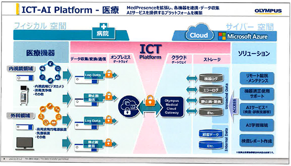 ICT-AIプラットフォームは,ISMの遠隔医療支援ソリューション「MedPresence」をベースに,日本マイクロソフト(株)のクラウドプラットフォームである「Microsoft Azure」を使用する。医療機関の検査データなどを高いセキュリティの下でクラウド上に転送,管理し,データ収集やAIサービスを提供する。同プラットフォームを利用することで,医療機関は内視鏡検査におけるICTを活用した業務負担軽減やAIによる診断支援,レポート作成の自動化などが可能になる。オリンパスではこのほか,外科手術や研究においても,業務効率化につながる価値を提供するという。