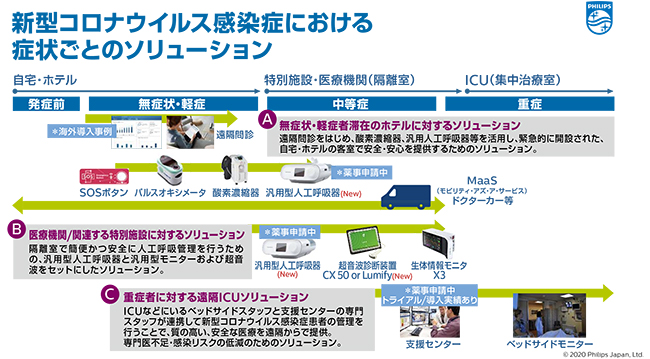 医療機関に入院する軽症者・中等症者に対するソリューションとしては,超音波診断装置や生体情報モニタ,人工呼吸器などがある。超音波診断装置については,スマートデバイスを用いた超音波診断装置「Lumify」を,新型コロナウイルス感染症対策のパッケージとして限定的に先行提供する。軽症〜中等症患者向けの汎用型人工呼吸器は,マスク・挿管の両方に使用可能で,重症患者用に人工呼吸器を確保するためのソリューションとして提供される。また,ヘルスケアモビリティ(MaaS)を新型コロナウイルス対策用に提供することも可能で,ホテルなどに滞在する患者に対し検査や診察が必要となった場合に医療従事者が出向くことで,来院受診による感染の広がりを防ぎながら医療を届けることができる。