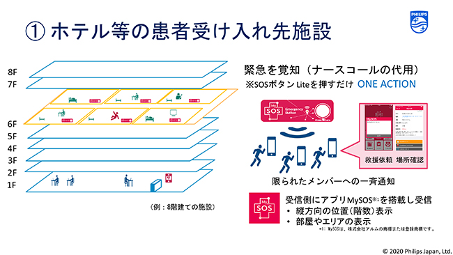 無症状・軽症者が自宅やホテルなどで療養するケースに対するソリューションとしては,「SOSボタンLite」やクラウドを利用した来院希望者への遠隔問診などが挙げられる。このうちSOSボタンLiteは,心肺停止からの社会復帰率世界一をめざすフィリップス・ジャパンの「Heart safe city」構想において活用されている「SOSボタン」をベースにしたもので,ホテルなどの患者受け入れ施設においてナースコールの代用として,また,独居高齢者などが自宅で療養する場合の地域のナースコールとして活用できる。さらに,酸素濃縮器や人工呼吸器,パルスオキシメータなどをパッケージで提供していく。
