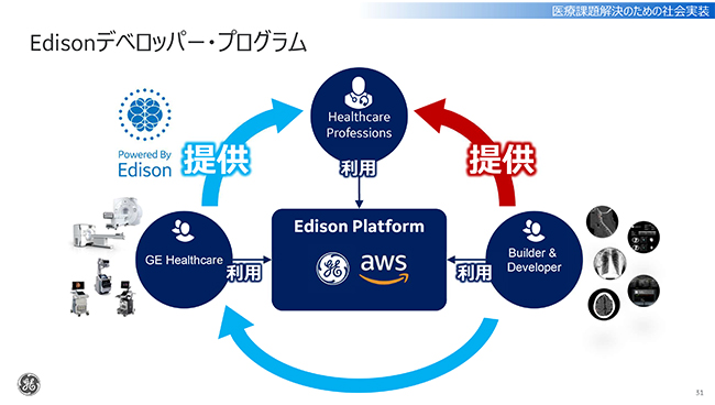 GEヘルスケアでは,世界的にAIブランドの「Edison」を展開しており,開発環境である「Edison Platform」を用いて,CTなどの画像診断装置に搭載する「Edisonスマートデバイス」やソフトウエア単体として提供する「Edisonアプリケーション」としてAIの製品化を進めている。このEdisonデベロッパー・プログラムにより,自社だけでなく国内外の企業とのパートナーシップの下に医療分野のAI開発を進めていく。