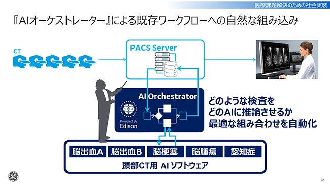 Edisonデベロッパー・プログラムについて,同社では高品質なAIを開発するプラットフォームをパートナーと共有するサービスと位置づけている。迅速かつ効率的なAI開発を行うためのアプリケーションや,精度・品質を検証するためのツールを提供する。また,日常の検査・画像診断の中でAIを使用できるようにするために,ワークフローにAIを組み込む仕組みを用意する。この仕組みは「AIオーケストレーター」と呼ばれ,ある検査の画像診断に対して,どのAIを適用するか,最適な組み合わせを自動的に設定する。プログラミングツールとして提供され,コーディングなどの専門的な知識なくてもユーザー自身が容易に行うことができ,日常臨床の中で最適なAIの選択が可能になる。