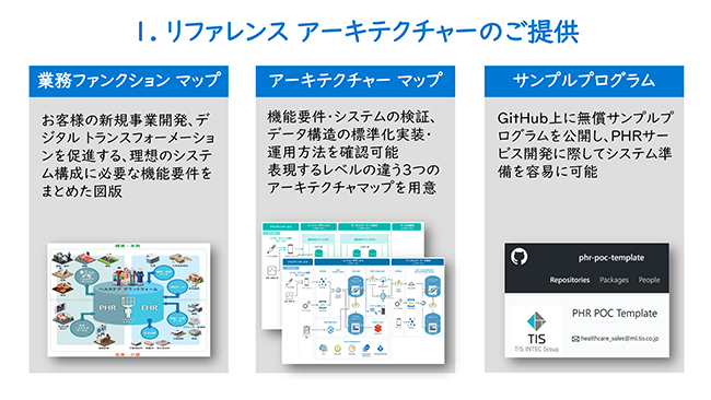 ヘルスケア リファレンス アーキテクチャーは,ヘルスケアサービス開発に必要となる要件などを定型化したもの。システムベンダー向けに,(1)業務ファンクション マップ,(2)アーキテクチャ マップ,(3)サンプルプログラムを用意する。業務ファンクション マップは,DXを促進するシステム構築に必要な機能要件をまとめた図版。また,アーキテクチャ マップは,機能要件・システム検証,データ構造の標準化実装・運用方法を確認できるマップで,3種類用意される。サンプルプログラムは,ソフトウエア開発のプラットフォームであるGitHub上に無償サンプルプログラムを公開してPHRサービスの開発を支援する。すでに,日本糖尿病学会などが作成した「生活習慣病コア項目セット集(第2版)」などを基にした糖尿病診療向けのプログラムが公開されている。システムベンダーは,ヘルスケア リファレンス アーキテクチャーの利用することにより,高いセキュリティを確保し標準規格を用いたシステムを,短期間かつ低コストで開発可能となる。