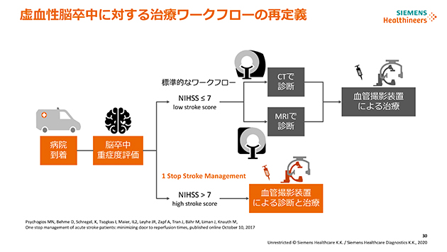 このようなグローバルでの展開の中で国内市場を請け負うシーメンスヘルスケアについて,森社長は,イメージング,ダイアグノスティクス,アドバンストセラピーの事業領域に対し,「新たなビジネスモデルの構築」「One Healthineersとしてのアプローチ」「デジタルカンパニーの推進」に取り組むと述べた。イメージング事業では,“デジタル”をキーワードに挙げて,画像診断装置だけでなく,AIソフトウエア“AI-Rad Companion”や遠隔検査プロトコール支援システムの「syngo Virtual Cockpit」などによる新たなマーケットを創出する。AI-Rad Companionは,6月から国内で胸部CT画像AI解析受託サービスを開始しており,今後,MRIでの脳体積計測や前立腺がんのMRIガイド下生検のAIソフトウエアの提供も準備している。また,ダイアグノスティクス事業では,免疫・生化学統合分析装置「Atellica Solution」をはじめとしたAtellica製品のポートフォリオの拡充などを行っていく。一方,アドバンストセラピー事業について森社長は,一例として,2019年11月に発売した血管撮影装置「Artis icono D-Spin」でのワンストップ・ストローク・マネジメントによって,CTやMRI検査を省略した迅速な診断・治療が可能になると紹介した。