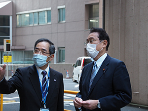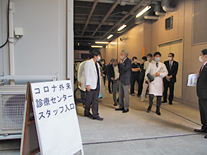 10月2日(金)には見学会が開催され,衆議院議員の岸田文雄氏,石原伸晃氏,根本 匠氏,盛山正仁氏,平口 洋氏,畦元将吾氏,日本医学放射線学会理事長の青木茂樹氏や日本診療放射線技師会会長の上田克彦氏ら医療関係者,また,プレハブCT室の施工を担当した技研興業(株)やキヤノンメディカルシステムズなど関係者が参加。コロナウイルス感染患者用に改修されたICUやコロナ外来診療センターを視察した。