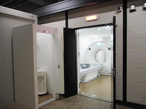 プレハブCT室に設置された低被ばく検査が可能な「Aquilion Lightning/Helios i Edition」 |