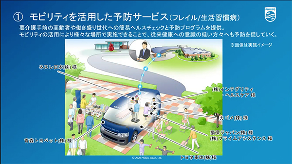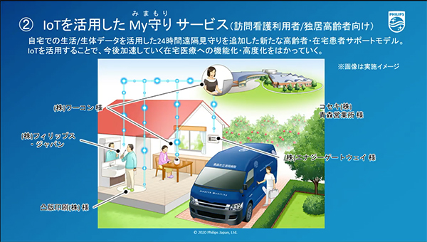 ヘルステックを核とした健康まちづくり連携協定は,青森市民の健康寿命延伸を基本コンセプトに,青森市浪岡地区をモデル地区として「ヘルステックを核とした健康まちづくりプロジェクト」を推進するもので,フィリップスと青森市が2019年2月に締結した。2021年5月に在宅療養支援病院としてリニューアルを予定している青森市立浪岡病院との連携,データ分析の拠点となるあおもりヘルステックセンターの構築,事業推進体としてのあおもりヘルステックコンソーシアムの設立など通して事業を展開し,ヘルステックを活用して市民の健康課題の解決をめざす。2019年度までに行った課題調査や実証事業も踏まえ,まずは(1)フレイルおよび生活習慣病の予防と,(2)在宅医療の強化サポートの2つをテーマに事業を進めることになった。具体的なサービスとしては,あおもりヘルステックコンソーシアムに参画する11社とともに,(1)モビリティを活用した予防サービスと(2)IoTを活用したMy守り(みまもり)サービスを提供する。