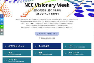 NECは,New Normal時代のデジタルイベントとして「NEC Visionary Week〜創ろう明日を,描こう未来を」を2020年11月12日(木)〜12月4日(金)までオンラインで開催した。11月12日と13日にオープニングセッションが,テーマセッションが11月24日〜27日と12月1日〜4日に行われ,2021年1月29日(金)までオンデマンド配信中である(https://wisdom.nec.com/ja/event/nvw/ )。