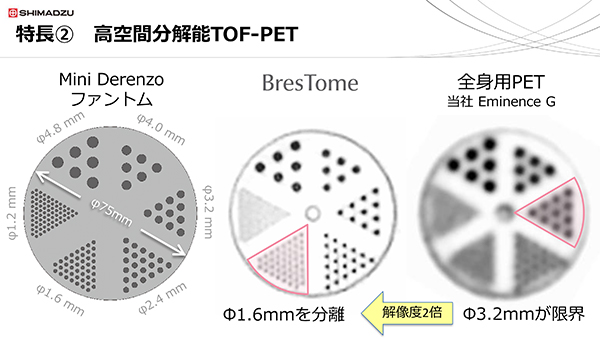 続いて,BresTomeの特長として(1)頭部・乳房の検査が1台で可能,(2)半導体+TOFにより高画質のPET画像を提供,(3)低被ばく,の3点を挙げた。特に同装置の核心として,2.1mm角の小型シンチレータとSiPM(Silicon Photomultiplier)半導体受光素子の組み合わせにより高空間分解能を実現したほか,TOF技術による高画質を実現。同社の全身用PETと比較して,解像度が約2倍に向上したことをアピールした。また,臨床現場へのBresTomeの導入により,頭部・乳房の検査枠を独立させることで全身検査数の増加が可能になるとした。