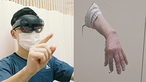 長崎大学病院にいる専門医がMicrosoft HoloLens 2を装着して診察(写真右は3Dホログラムのイメージ)(日本マイクロソフト株式会社提供)