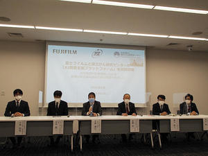 2021年4月13日(火)に,国立がん研究センター中央病院で関係者が出席し共同記者会見を行った。NCCからは研究所所長の間野博行氏,医療AI研究開発分野分野長の浜本隆二氏,同研究員の小林和馬氏,中央病院から放射線診断科医長の三宅基隆氏,脳脊髄腫瘍科医長の高橋雅道氏が出席。富士フイルムからは取締役専務執行役員メディカルシステム事業部長の後藤禎一氏,メディカルシステム開発センター長の鍋田敏之氏,同IT開発グループ長の桝本潤氏が出席した。