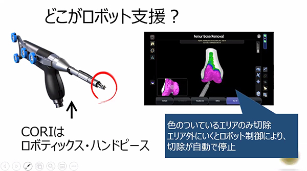 続いて,同社マーケティング部の大土井信介氏が,CORIに機能について映像を交えて紹介した。大土井氏は,CORIは安全かつ正確な骨掘削が行え,形状がより精密な前十字靭帯温存型インプラントに対応可能であるとした上で,CORIの活用を通じて,前十字靭帯温存型人工膝関節置換術の普及に貢献したいとした。なお,同社では年内に10数台,来年以降は20台以上の販売を目標としている。