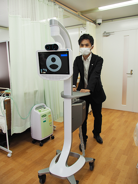Teladoc HEALTHは,医療現場と遠隔地を映像と音声でリアルタイムにつなぎ,遠隔地にいる医師と円滑にコミュニケーションがとれるシステム。遠隔地にいる医師は,PCやタブレットなどの端末からTeladoc HEALTHのカメラのアングル変更やズームの操作ができ,医師主導で遠隔での診察が可能になる。西部高齢者支援型臨時施設にはカート型の「Teladoc HEALTH Mini Cart」1台が導入され,市内の医療法人元気会わかさクリニックとつなぎ,医師が遠隔で診察を行う。Teladoc HEALTH Mini Cartは最大19倍の高倍率ズームが可能で,顔色やチアノーゼなど患者の様子,ベッドサイドのモニタリング機器などを良好に観察できる。バッテリー駆動が可能なカートタイプのため,施設では看護師が最大12床の病床を巡回し,わかさクリニックでは医師がiPadを使用して看護師とコミュニケーションを取りながら患者を診察する。