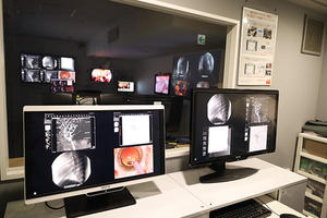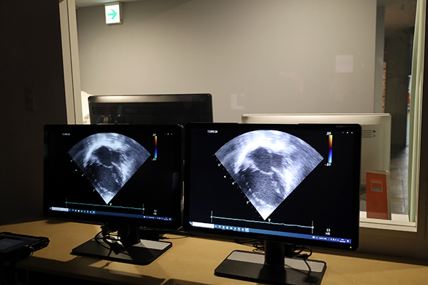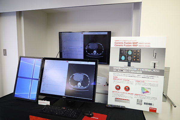 プレゼンテーション後にショールームで行われた製品デモンストレーションでは,新製品のMDAC-8355をはじめとする各装置のほか,ITEM2023で参考展示予定の超音波診断装置用ディスプレイ「MDAC-2323 Dual-layer LCD display」などが紹介された。