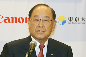 続いて,藤井氏が登壇し,同大学が2021年9月に定めた基本方針「U Tokyo Compass」の基本理念の一つである「多様性と包摂性」は,キヤノングループの基本理念である「共生」という考え方と共鳴するものがあると述べた。また,現状,人類社会が直面する地球規模のさまざまな課題を解決し,Well-Beingを実現するためには,大学だけではなく,市民や産業界との対話が重要であるとし,今回の産学協創のテーマである「“個々人のQuality of Lifeを最大化し,病とも共生する社会”の実現」に向け,キヤノンと共に取り組んでいけることへの期待を示した。
