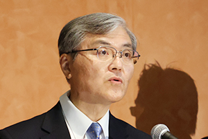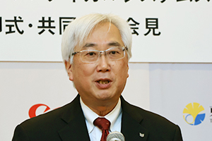 はじめに,御手洗氏が挨拶に立ち,本協定の目的について「“個々人のQuality of Lifeを最大化し,病とも共生する社会”の実現〜個別化医療の社会実装で多様な社会・医療要請を解決〜」を共通ビジョンとして,個々人に見合った最適な医療の提供を通し,Well-Beingな社会の実現をめざすものであると概説した。先進国においては「人生100年時代」と言われており,Well-Beingを実現し豊かに生きるためには病との共生が必要であると指摘。そうした課題認識に対し,志を同じくする三者で産学協創を開始できることは非常に意義深いことであると述べた。