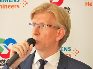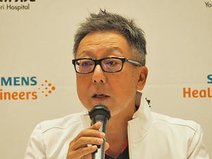 次に,同社アドバンストセラピー事業本部 事業本部長の荒川泰一郎氏が,「先進機器の導入によるシーメンスヘルスケアの貢献について」と題して,同事業部の代表的な製品ラインアップや網羅する診療領域,本パートナーシップで導入される機器などを紹介した。なかでも,セルフドライビング機能が搭載された革新的な装置であるCIARTIC Moveは,3D撮影を行いながら装置が自動で適切なポジションに移動するほか,ワイヤレスリモコンでの操作も可能なため,スタッフ一人で簡単に操作することができる。荒川氏は,これらの技術によって術中の画像ワークフローを自動化できるため,手術室での人員不足解消やスタッフの負担軽減,装置の移動や位置決めなどに要する時間の削減などに貢献すると強調した。さらに,ドイツ本社Clinical Segment Surgery Global HeadのPeter Seitz氏は,CIARTIC Moveについて,発売後6か月で,すでに世界で1500症例の治療に貢献していると述べた。