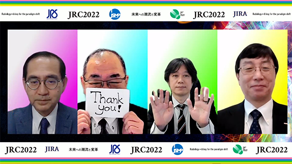 5月16日(月)には合同閉会式が行われた。第78回日本放射線技術学会(JSRT)総会学術大会の市田隆雄実行委員長(大阪公立大学医学部附属病院)が司会を務め,一般社団法人日本ラジオロジー協会(JRC)の金澤 右代表理事,第81回日本医学放射線学会(JRS)総会の村上卓道会長(神戸大学),第78 回日本放射線技術学会(JSRT)総会学術大会の白石順二大会長(熊本大学),第123回日本医学物理学会(JSMP)学術大会の西尾禎治大会長(大阪大学),2022国際医用画像総合展(ITEM 2022)を主催する一般社団法人日本画像医療システム工業会(JIRA)の山本章雄会長がオンラインで参加。閉会に当たって挨拶した。