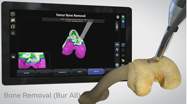 カッティングバーの先端を制御します。計画した範囲と深さで作動し,計画外のエリアでは動きを停止する制御を行い,正確な骨切りを支援します。画像の紫,青,緑色のエリアでバーが作動し,骨切除を行います。