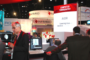 CTでは,320列のAquilion ONE,160列のAquilion Premium,64列128スライスのAquilion CXの3台の実機を展示した。展示テーマの“Episode of Care”に関連して,Aquilion ONEの導入による臨床的,経済的な効果を中心にアピールしたほか,これからの新しいCT技術として,被ばく低減技術AIDR(Adaptive Iterative Dose Reduction)とデュアルエナジーを紹介した。