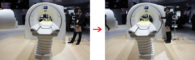 横スライド寝台と心臓専用のBow-tieフィルタを組み合わせた被ばく低減技術“IntelliCenter”も特長のひとつである。寝台が,左右にそれぞれ8cm(計16cm)スライドすることにより,被検者の心臓をFOVの中心にセットすることができ,かつ,専用のBow-tieフィルタによりFOV辺縁部の被ばくを抑えることができる。IntelliCenterにより,FOV全体では24%,FOV外側では35%の被ばく低減が可能となる。