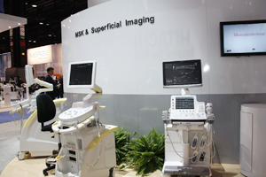 2011年4月にアロカ(株)が日立メディコグループに加わり,日立アロカメディカルとして事業を統合した。両社は以前より,業務提携・資本提携による協業を進めていたが,統合により超音波診断装置のラインナップの幅が広がり,領域や性能,価格など,よりユーザーの要望に応じた装置の提供ができるようになっている。会場では,超音波のコーナーをブースの一角に設け,領域別に装置を配し,各領域においてどのような有用性を発揮するかをポイントに展示,紹介した。また,ステージではプレゼンテーションが行われた。