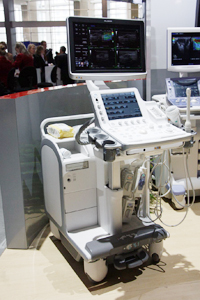 今回は,ラインナップの中から,「HI VISION Ascendus」「ProSound F75」「HI VISION Preirus」「ProSound α7」「HI VISION Avius」「ProSound α6」の6機種を展示。中でも,2011年2月に発売し,RSNA初展示となった最上位機種Ascendusは,日立グループの最先端技術を集結させ高画質を実現している。次世代の信号処理回路Ultra BE(Ultrasound Broadband Engine)を進化させたUltra BE Uと高感度・広帯域探触子により,高空間分解能・コントラスト分解能を実現し,浅部から深部まで均一な画像を得ることができる。また,世界で初めてリアルタイムにエラストグラフィの3D像を表示可能にしたリアルタイム3D(4D)エラスト機能など,さまざまな新しいアプリケーションに対応している。