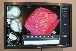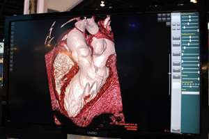 ザイオソフトでは,昨年のRSNAで大きくアピールしたスーパーコンピューティング技術に基づいた画像処理技術“PhyZiodynamics”により生成された欠落の無い4D画像のリアルタイム表示や、従来定量化が困難であった心壁の速度や加速度等の情報を4D画像に合成する表示を可能とするPhyZiodynamic inVivo(W.I.P.)による症例画像を紹介した。心房内にできた腫瘍の動きの観察では従来のCT画像では判別し難い動きを観察する事ができる。拍動や動きの速度の解析など,PhyZiodynamic inVivoでは,従来のCT画像や3Dワークステーションでは不可能だった,形態,動態,機能の同時表示を可能にしている。数十位相に相当するボリュームデータを劣化させることなく、画像の回転や拡大を4D再生させながら変更が可能であり、アルゴリズムと計算処理技術の高さを感じさせた。