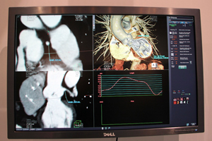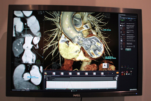経カテーテル的大動脈弁置換術(TAVI)における術前のプランニングを行うアプリケーションソフトである。TAVIでは,正確で安全性の高い手技を行うために術前の画像情報が求められているが,CT画像では大動脈弁の動きを正確に把握することが難しかった。“TAVI計測シミュレーション”では,実際に大動脈弁にROIをおいて4Dで再生することで,設定したROIの位相による変化を大きさや弁の円周などをダイナミックに計測することが可能である。PhyZiodynamicsの技術を用いて,10位相のCTの時系列データから大量の位相データ(今回は35位相)に補完することで,弁の動きの追従や計測,変化を動きとグラフで把握することができる。