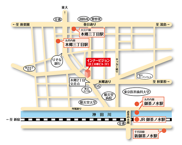 - 丸の内線 本郷三丁目駅 1番出口より徒歩3分