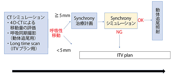CTシミュレーションの結果,呼吸性移動が5mm以上の場合は動体追尾照射を検討する。Synchronyシミュレーションを行い,事前に動体追尾照射適応の可否を判断する。
